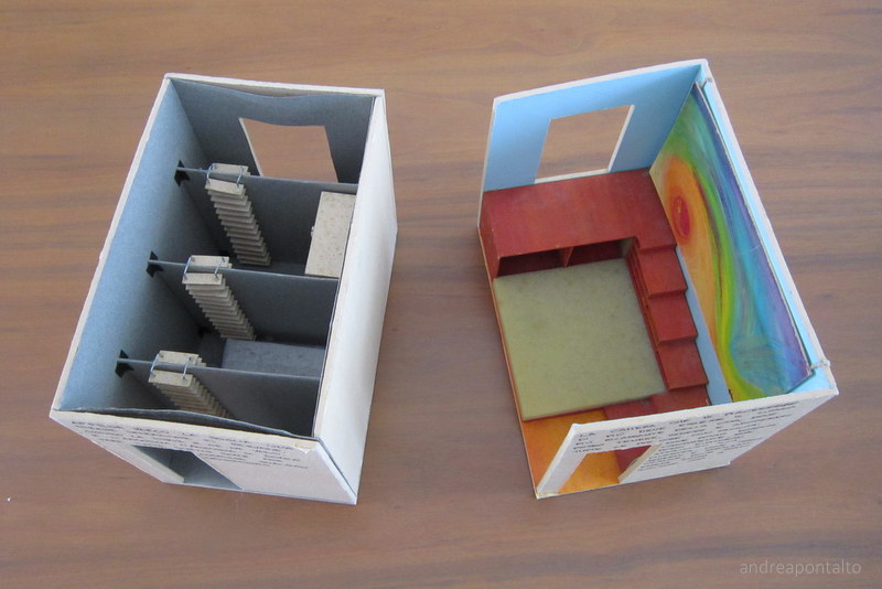 | workshop politecnico di milano (2000) prof. corrado levi crea la stanza che ti piace di più e quella che ti piace di meno "la camera che mi piacerebbe di più, deve essere il luogo più rilassante della casa, dove posso tenere, vedere e adoperare tutte le mie cose con facilità, dove posso dormire comodamente, dove posso dipingere affacciato alla finestra, dove posso sedermi e sdraiarmi ovunque, dove posso essere sopra a qualsiasi cosa." "appena varco la soglia una strana sensazione mi pervade, chiudo la porta e me ne vado. è l'angoscia, l'angoscia di dover fare tutte quelle scale per compiere qualsiasi spostamento." |